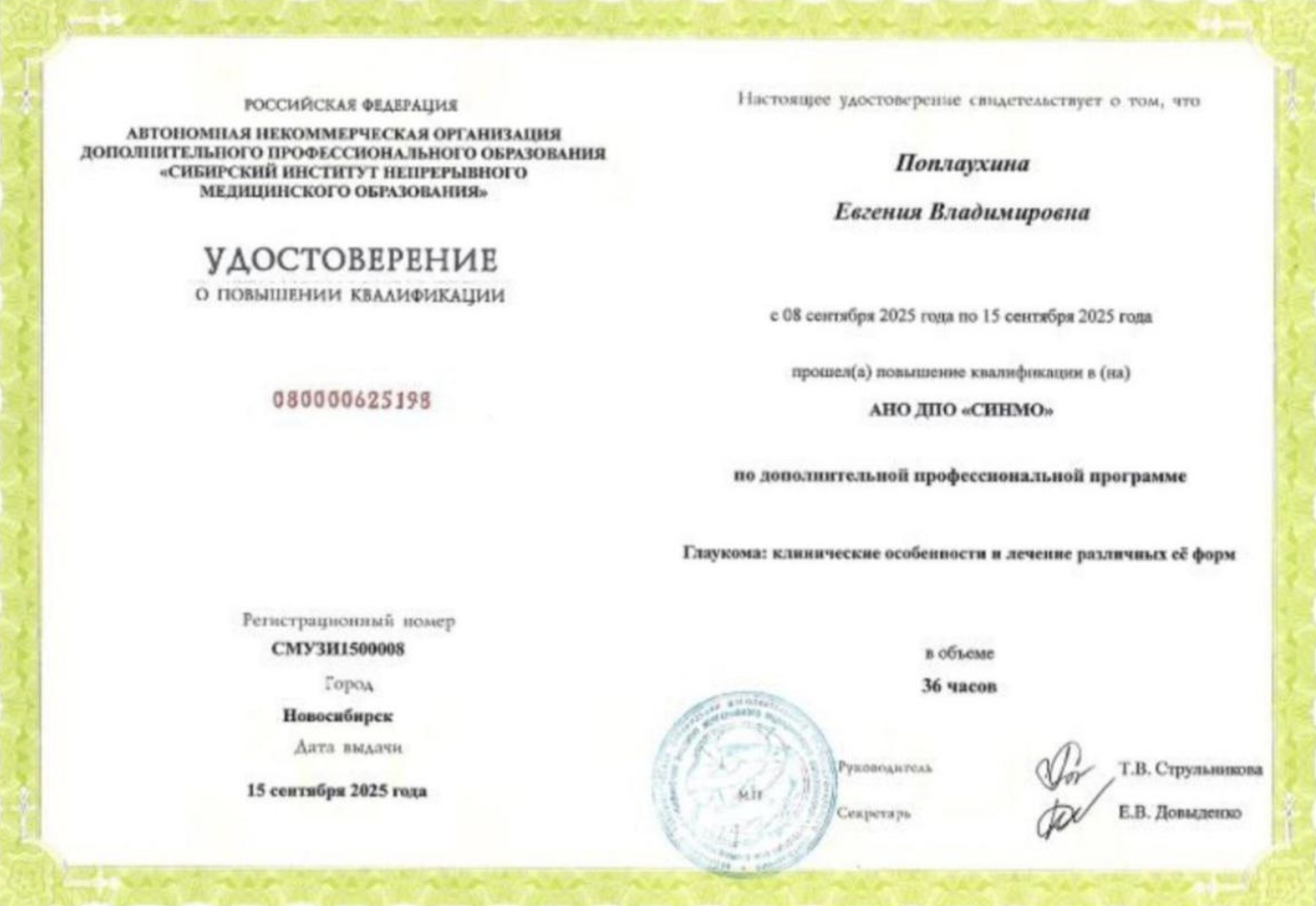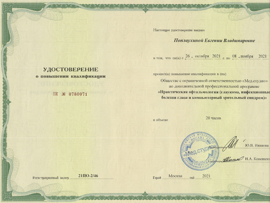 ООО " Медстудио" по дополнительной профессиональной программе "Практическая офтальмология ( глаукома,инфекционные болезни глаз и компьютерный зрительный синдром)