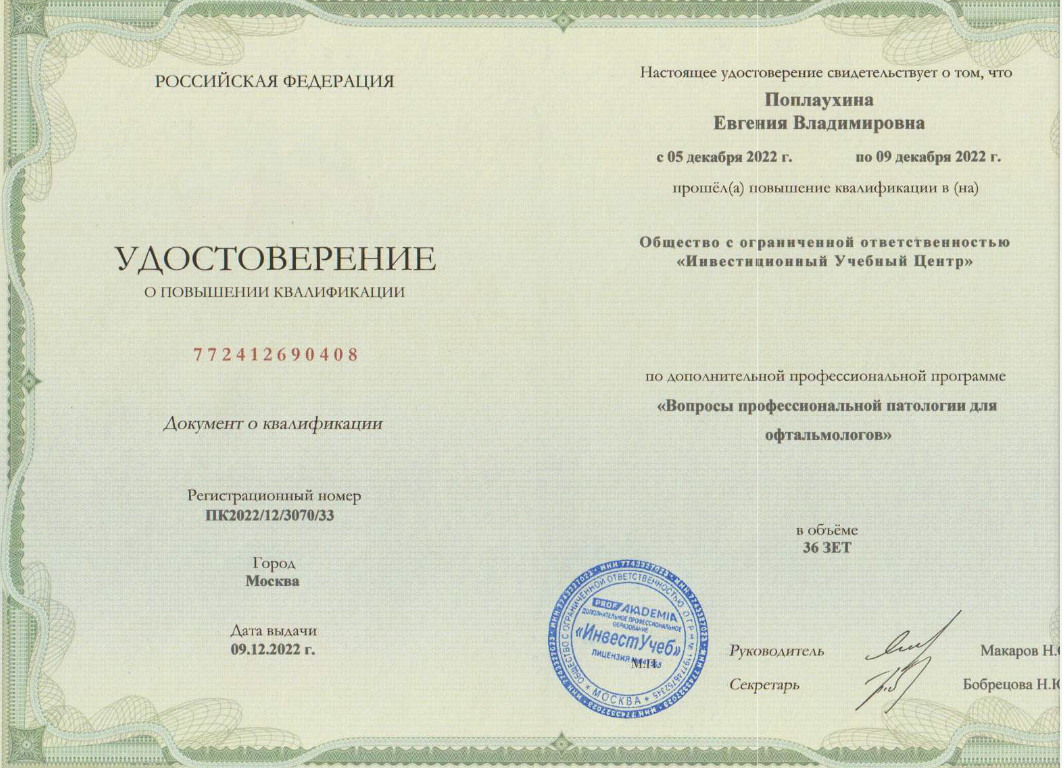 Общество с ограниченной ответственностью "Инвестиционный учебный центр"по дополнительной профессиональной программе " Вопросы профессиональной патологии для офтальмологов.