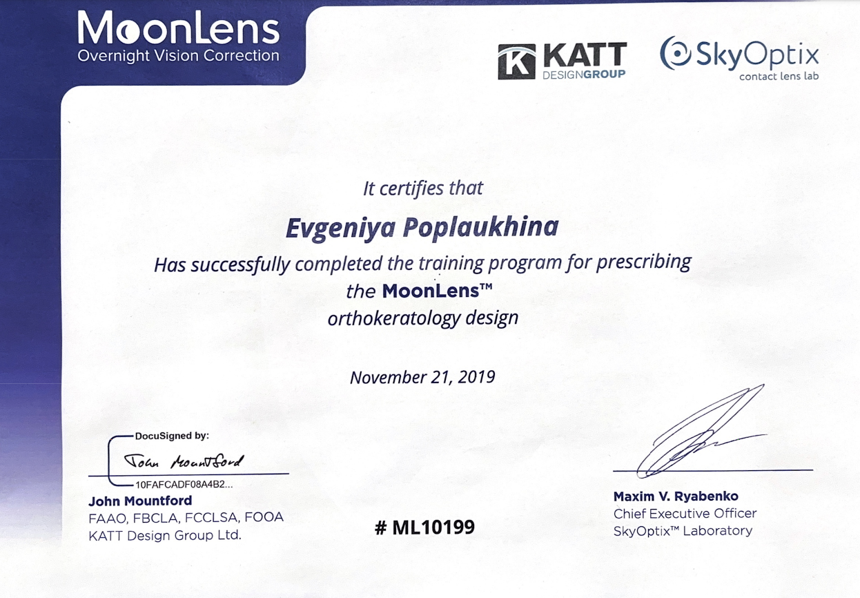 Успешно завершила программу обучения по назначению ортокератологических линз